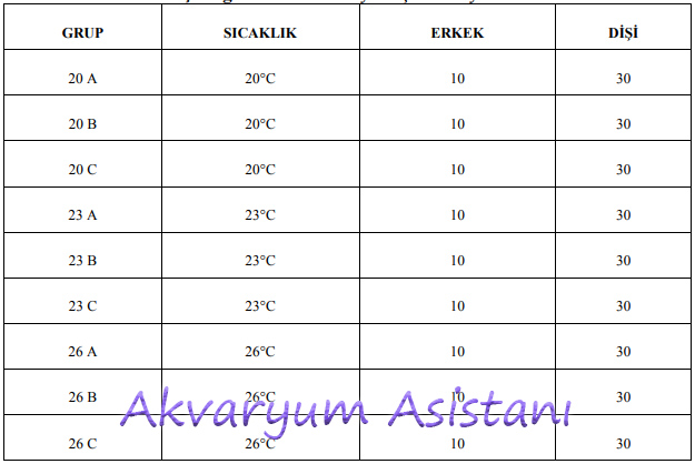 Bu çalışmada kardeş olan balıkları ayırıp 3 farklı su sıcaklığı olan akvaryumlara konulmuştur. Her ısıda 3 farklı gurup bulunmaktadır. Toplam 9 akvaryumdan oluşan bu testte su sıcaklığı 20°C, 23°C ve 26°C olarak sabitlenmiştir. Her gurupta 10 erkek 30 dişi bulunmaktadır.